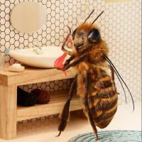 bathroom items around the bee, such as soap dispenser, toothbrushes, and bottles, which adds a humorous element to the scene because it's unusual for insects like bees to engage in activities typically associated with humans. The setting is a small,