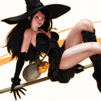 a traditional witch's hat, complete with pointed top and a broomstick, which she holds in one hand while seated on the other. Her attire includes