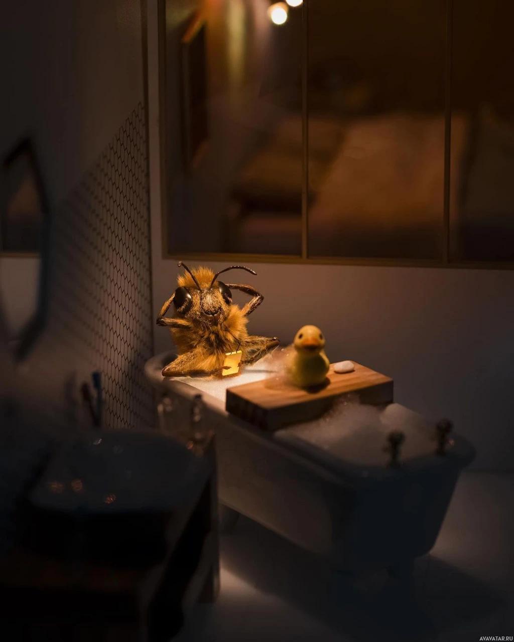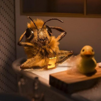 miscellaneous items including what appears to be a cup and a bottle. This setting creates an unusual combination of objects, suggesting a playful or artistic arrangement rather than a typical