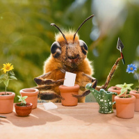 The image shows a bee sitting at what appears to be a table with