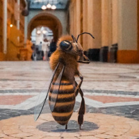 На картинке изображена пчела на кафельном полу. Судя по всему, это помещение с высоким потолком, возможно, внутри здания, подобного музею или историческому памятнику. На заднем плане видны арочные окна и колонны, что говорит о том, что архитектура спроектирована таким образом, чтобы создавать впечатление величия.
