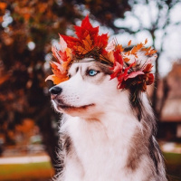 The picture shows a dog with a wreath or crown of