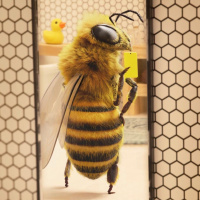 На картинке изображена пчела, стоящая перед зеркалом и делающая селфи с помощью своих лапок. Это забавная сцена, которая очеловечивает насекомое, демонстрируя его поведение, похожее на человеческое. На заднем плане - раковина и желтая резиновая уточка, которые дополняют причудливую обстановку.