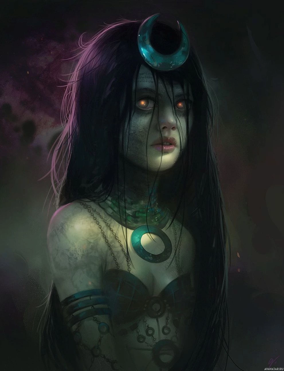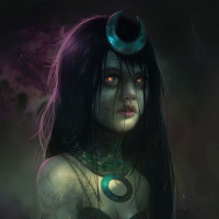 a crescent moon on her forehead, suggesting she might have some sort of mystical or supernatural significance. Her eyes are closed, giving her an eerie appearance. The overall aesthetic of the image suggests it could be associated with themes such as