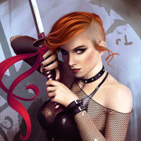 fishnet stockings and what seems to be a leather or latex bodysuit. In her hands, she holds a sword wrapped in