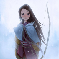 The image features an animated character, a girl with brunette hair, wearing traditional archer attire. She has a bow in her hand and is set against a snowy background that suggests she might be from a fantasy or historical setting, possibly depicting a scene of winter hunting or adventure.