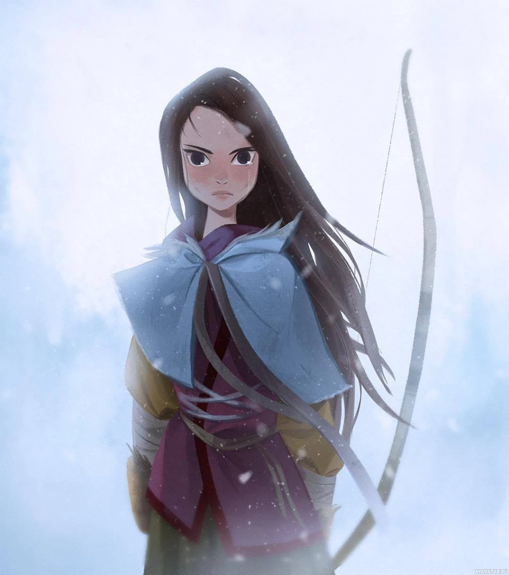На картинке изображен анимационный персонаж, девушка с темными волосами, одетая в традиционную одежду лучницы. В руке у нее лук, и она изображена на фоне снега, что наводит на мысль о том, что она может быть из фантастического или исторического мира, возможно, изображающего сцену зимней охоты или приключения.
