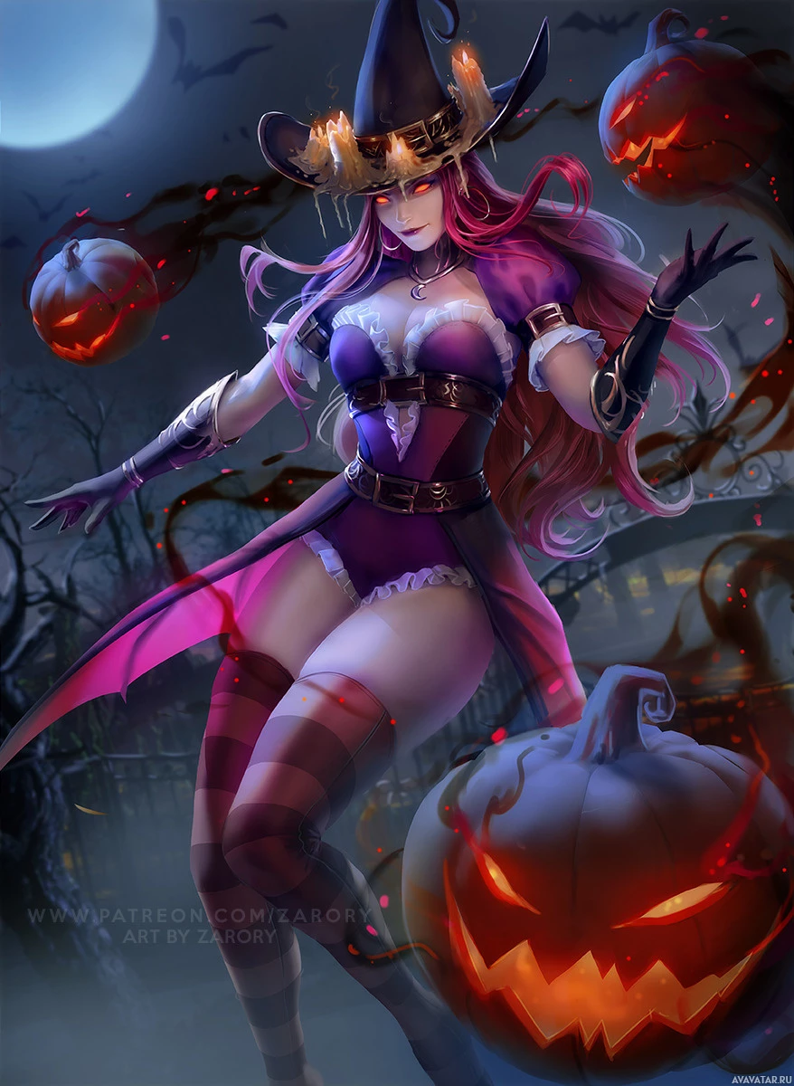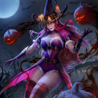 pink hair and is wearing what appears to be witch attire, including a pointy hat which is often associated with traditional witch costumes. She is surrounded by Halloween motifs such as jack-o'-lanterns and bats in the background, suggesting that this might be a piece of artwork for