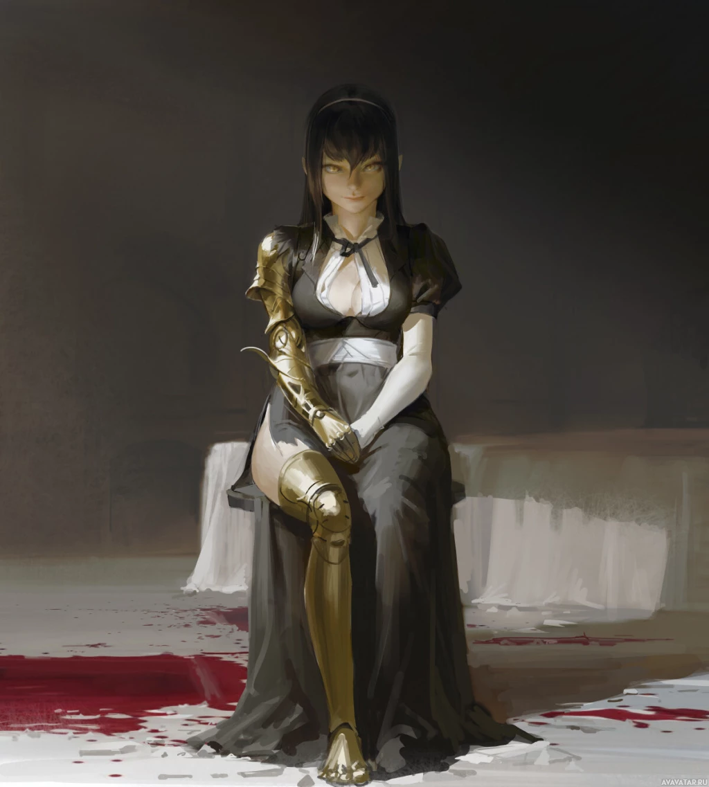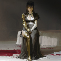 a young girl with brunette hair. She is wearing what looks like medieval or fantasy-style armor, and her pose suggests she might be deep in thought or contemplating something. The setting seems to be dark and somewhat ominous, with
