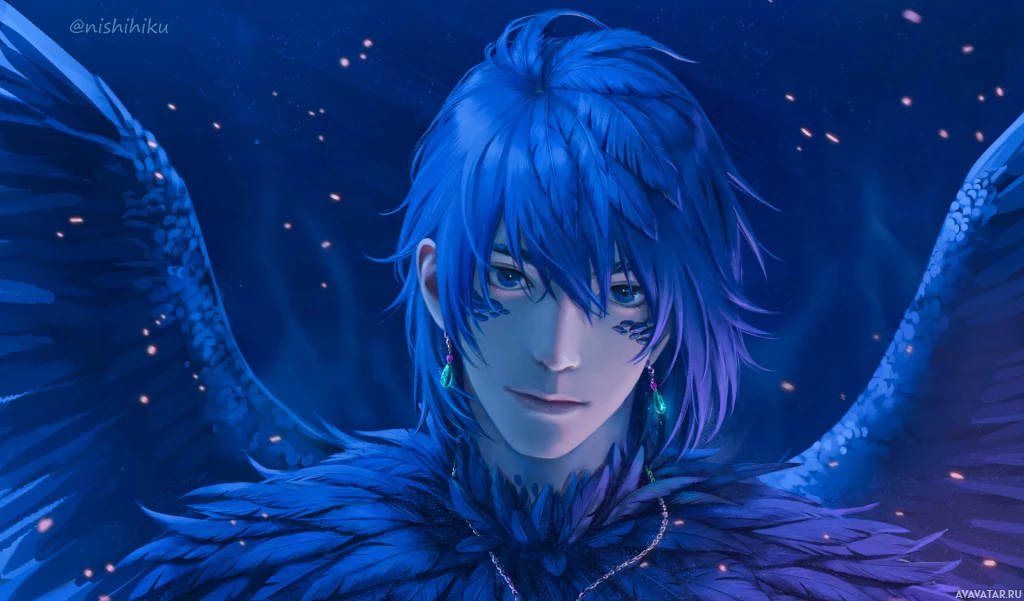 blue hair, wearing a costume that includes wings. The character is stylized in