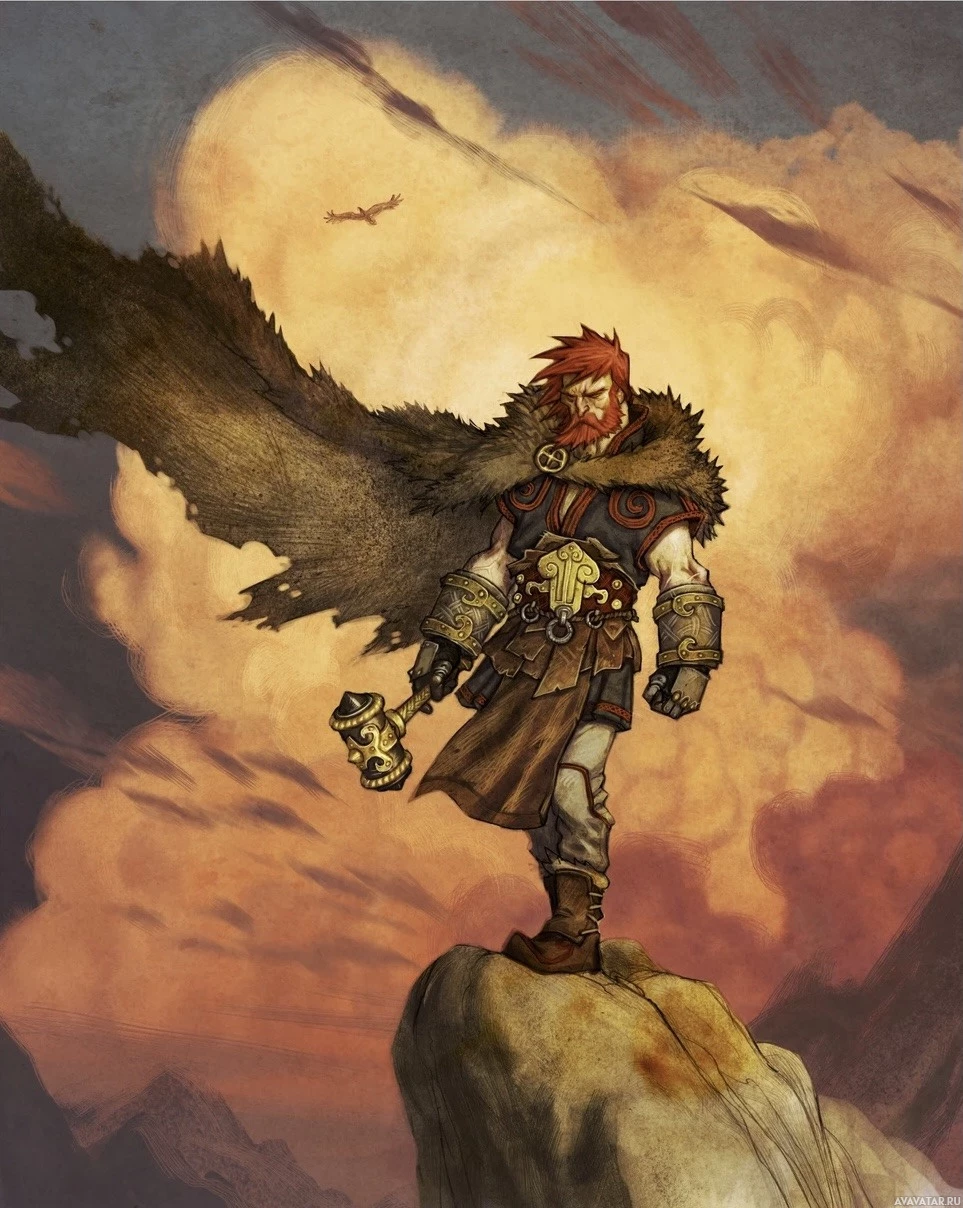 red hair and a beard, wearing armor and carrying a shield and a staff. They are standing on what looks like