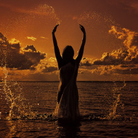 The image features a silhouette of a woman with her arms raised in the air, standing waist-deep in water. The sky is filled with warm hues that suggest either sunrise or sunset. It appears to be a serene and possibly reflective moment for the individual. The overall setting suggests a peaceful environment near the ocean or a large body of water.