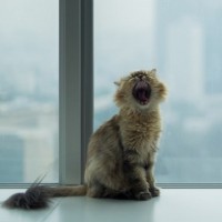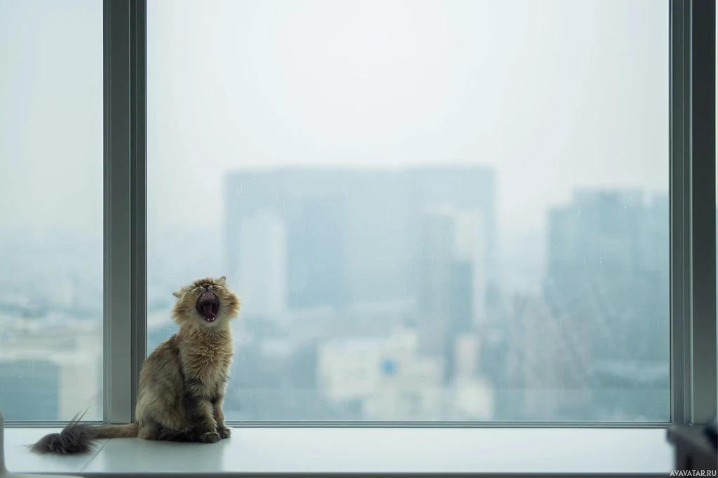 The image shows a cat perched on a windowsill. The cat appears to be looking out of the window with its mouth open, possibly meowing or yawning. There is
