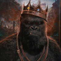 portrait of a gorilla wearing a crown, with jewelry around its neck. It has a dramatic and artistic presentation, likely designed to evoke
