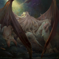 The image depicts a fantastical creature that resembles the mythical sea monster known as Cthulhu from the works of H.P. Lovecraft. It has tentacles and is surrounded by an otherworldly, dark environment that suggests a deep sea or underground setting. The artwork is rich in detail and evokes a sense of mystery and horror typical of the fantasy and cosmic horror genres.