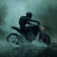 The image shows a person riding a motorcycle on what appears to be a rainy or misty night with an urban setting. The scene has a moody and atmospheric quality, possibly suggesting a narrative of survival, adventure, or mystery.