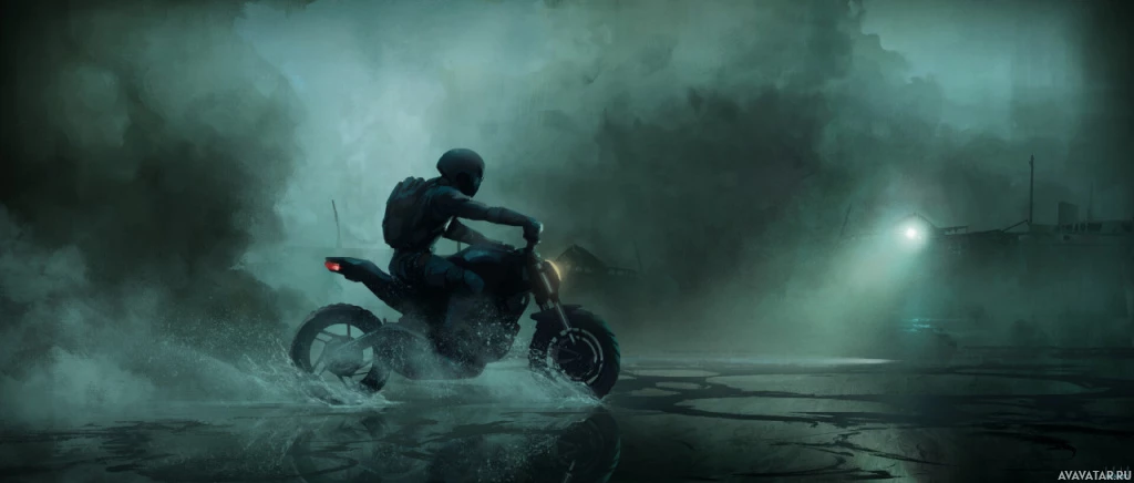 На картинке изображен человек, едущий на мотоцикле в дождливую или туманную ночь в городской обстановке. Сцена получилась мрачной и атмосферной, что, возможно, наводит на мысль о выживании, приключении или тайне.