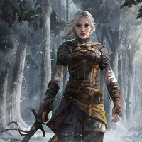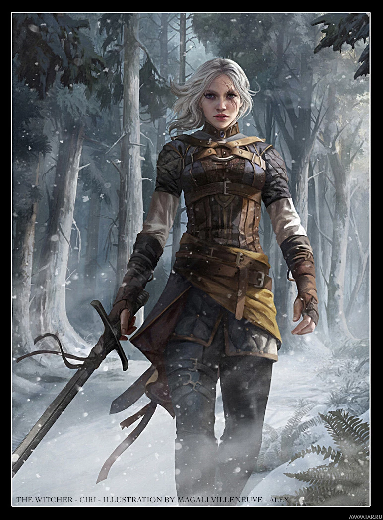 На картинке изображен персонаж женского пола с белыми волосами, стоящий в заснеженном лесу. Она держит меч и, похоже, одета в доспехи или какую-то защитную одежду, подходящую для битвы. Обстановка позволяет предположить, что она, возможно, находится в поиске или приключении, учитывая зимний пейзаж вокруг нее.
