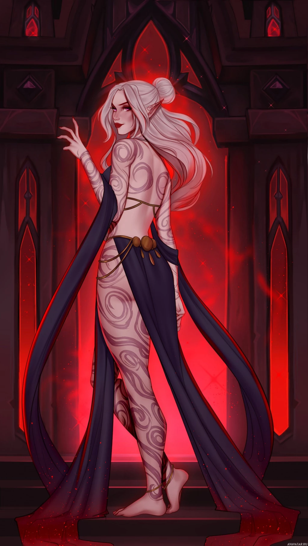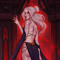 fantasy costume like robes and possibly some kind of armor. The background features dark and ominous tones, which might indicate that the scene takes place in a dangerous or shadowy environment, fitting the typical narrative of many
