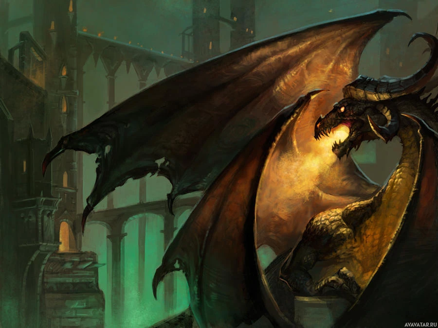 На картинке изображена фантастическая сцена с участием дракона. Дракон изображен с широко распростертыми крыльями, и кажется, что он стоит в агрессивной или величественной позе, возможно, охраняя замок или руины, которые являются частью фона. Художественный стиль предполагает, что это может быть ролевая игра, фантастический роман или подобный жанр, где драконы часто играют важную роль в качестве мифических существ или противников.