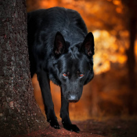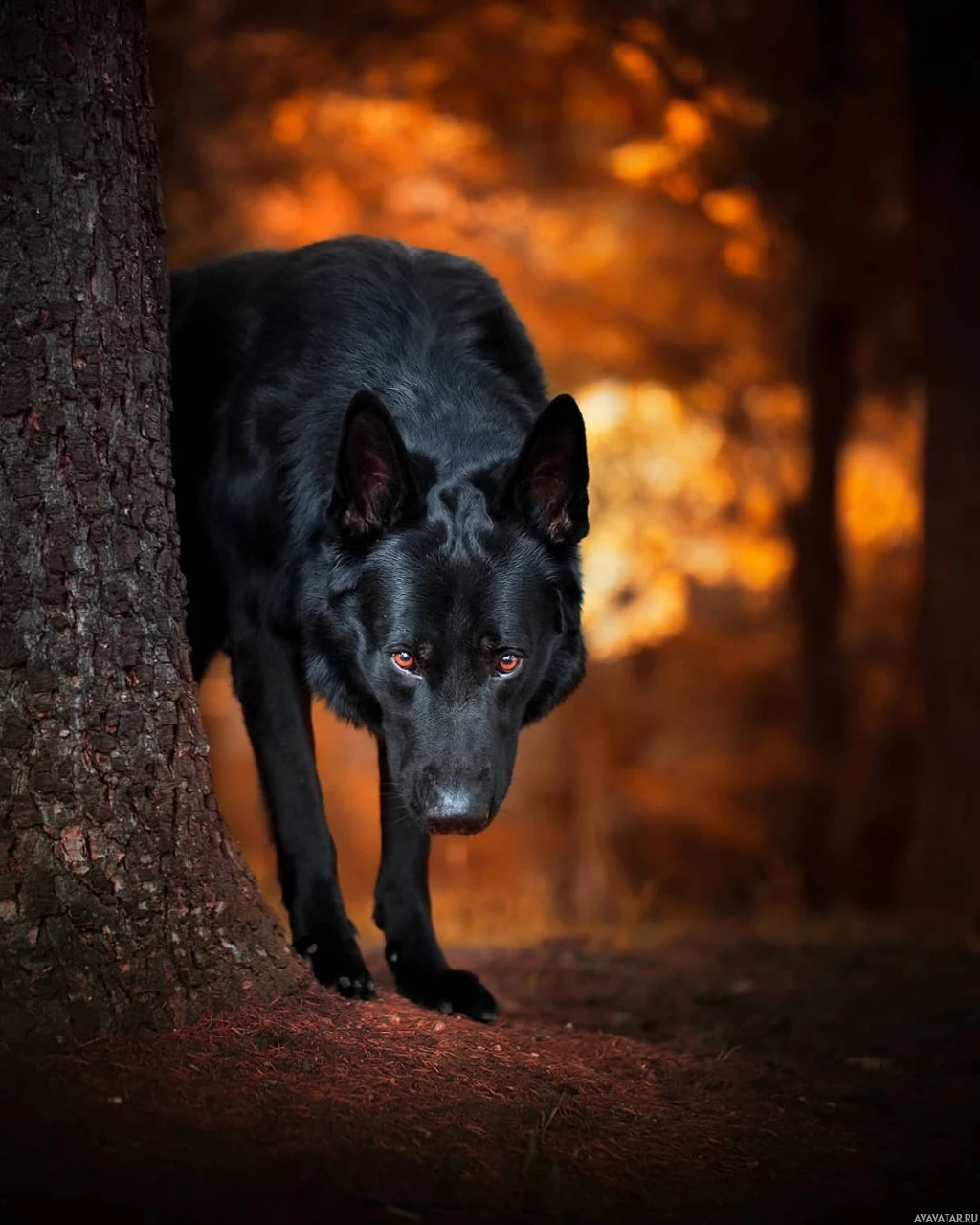 autumn foliage, given the warm-toned lighting that suggests sunlight filtering through the trees. The dog's expression seems contemplative or perhaps curious about something it sees or hears. The overall mood of the picture is somewhat mysterious and atmospheric due to the ambient lighting and