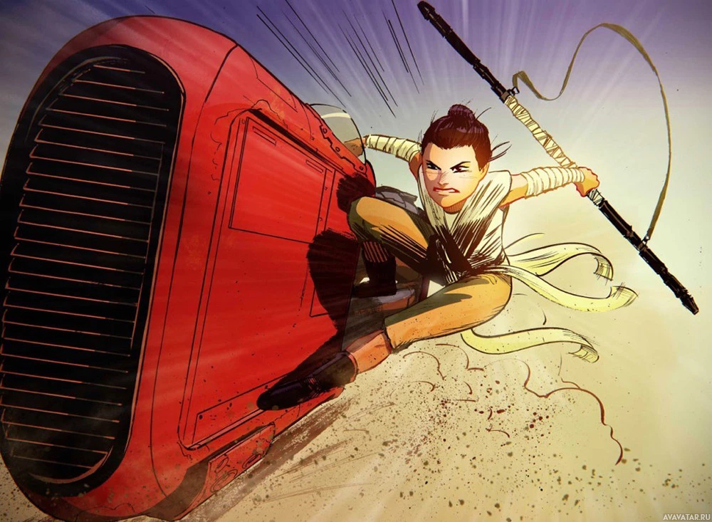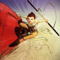the Star Wars franchise. She is shown in an action pose with her lightsaber drawn and pointed at the ground, as if she is ready to defend herself or strike. Her expression is focused and intense, reflecting her determination. Behind her, there is a red vehicle that appears damaged, suggesting