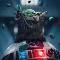 a sense of action or movement suggested by the positioning of Yoda holding something green and C-3PO having his arm raised.