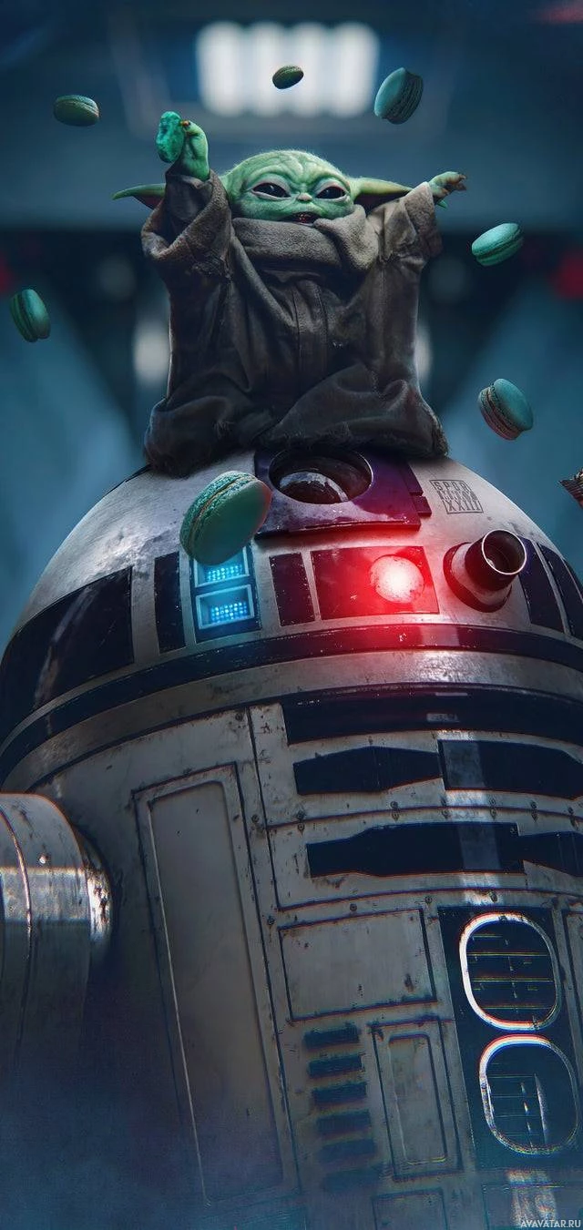 the Star Wars franchise: a C-3PO droid and Yoda. C-3PO is standing to the right of Yoda, who is sitting on top of him. They are in a setting that appears to be