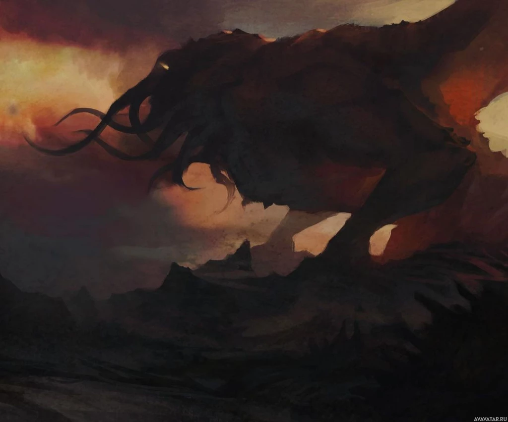 a fantasy scene with a creature resembling Cthulhu. It is set during what appears to be either sunrise or sunset, given