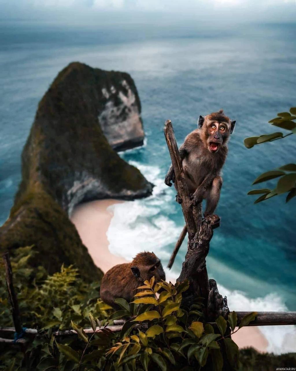 a rocky outcrop overlooking the ocean. One monkey appears to be making