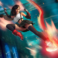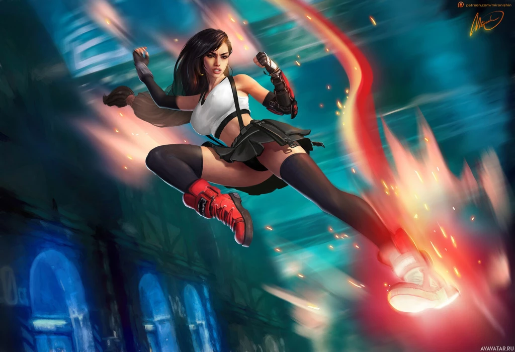 brunette hair. She is depicted in mid-motion, likely running or jumping, as indicated by the blurred motion lines around her body and