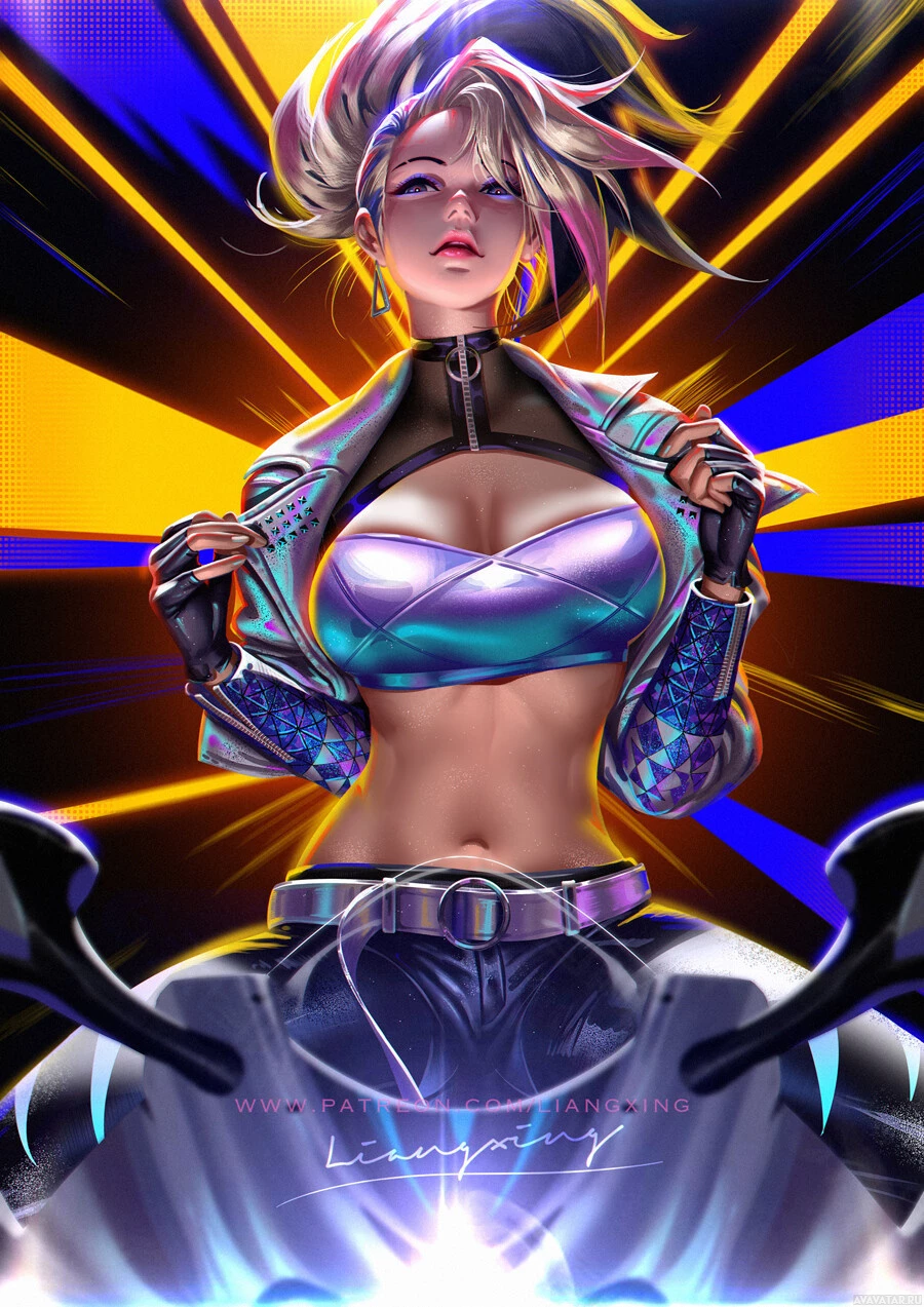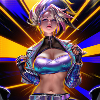 vibrant colors and a futuristic or cyberpunk aesthetic, wearing a sleeveless top with a high neckline, a crop-top with a graphic design on it, and tight pants with a thigh strap that resembles a gun. The character has