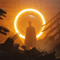 an apocalyptic scenario. In the background, there's a large circular light source illuminating part of the scene, which adds