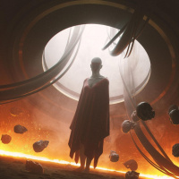 technology facility. There are also floating rocks or asteroids with a fiery appearance, adding to