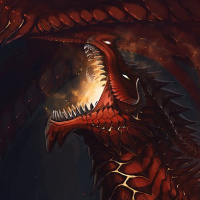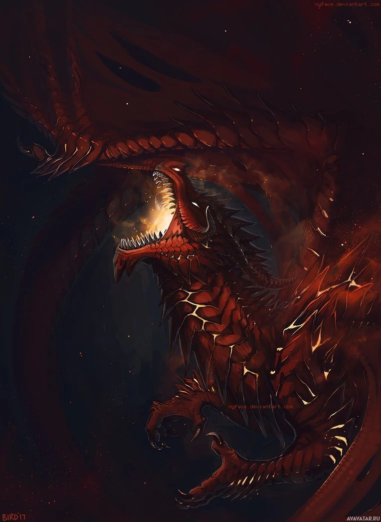 sharp teeth and is surrounded by flames, which gives it a fierce appearance. The setting seems to be dark and possibly in a cave or