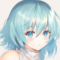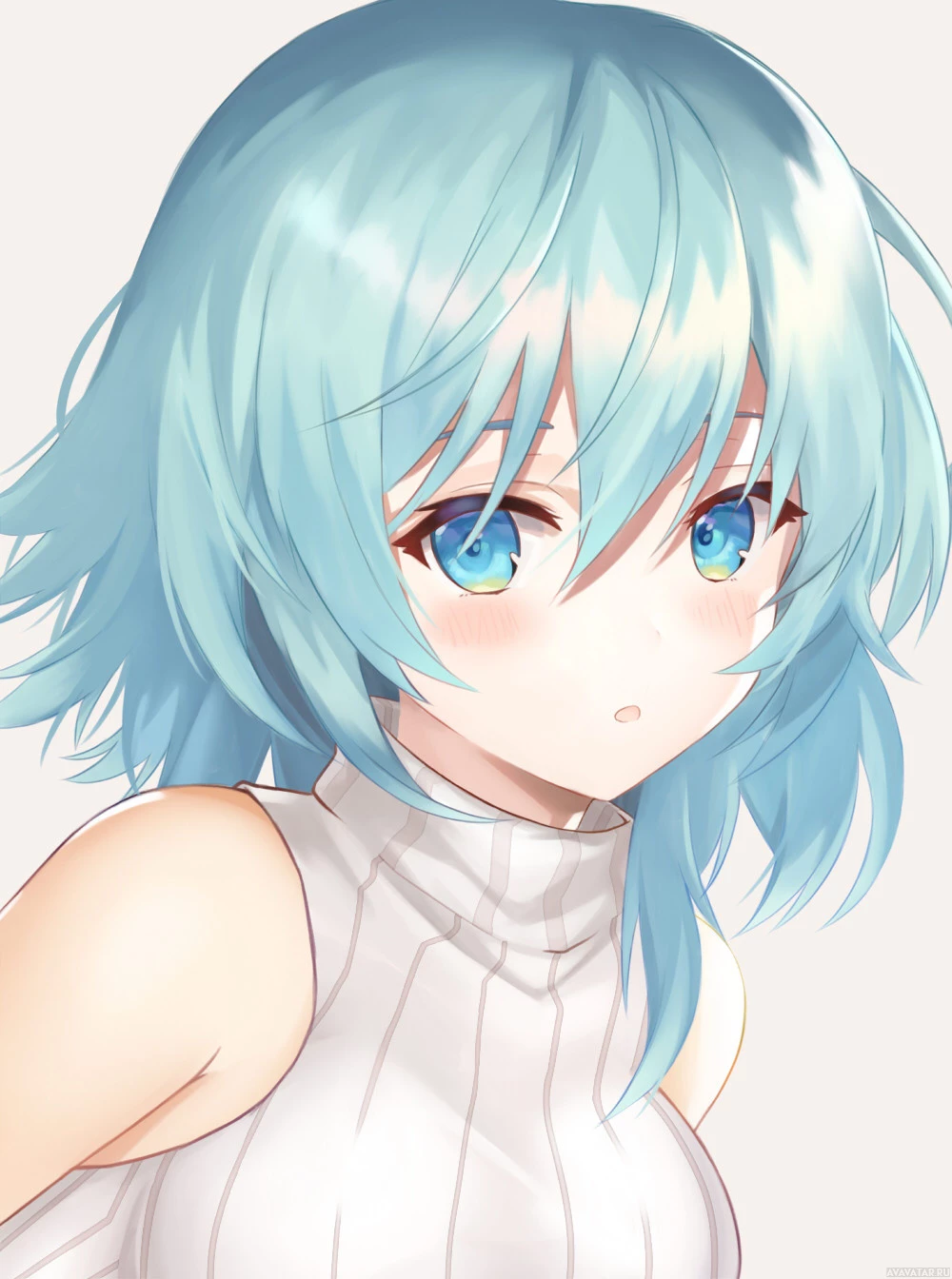 blue hair with strands floating in the air, giving the impression of motion or a magical ability. She has striking