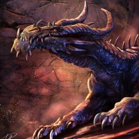 a fantastical creature, which appears to be a dragon. It is characterized by its large size with prominent horns and scales, and it's situated in what seems like a volcanic or rocky environment at night, as suggested by the dark surroundings and the warm,