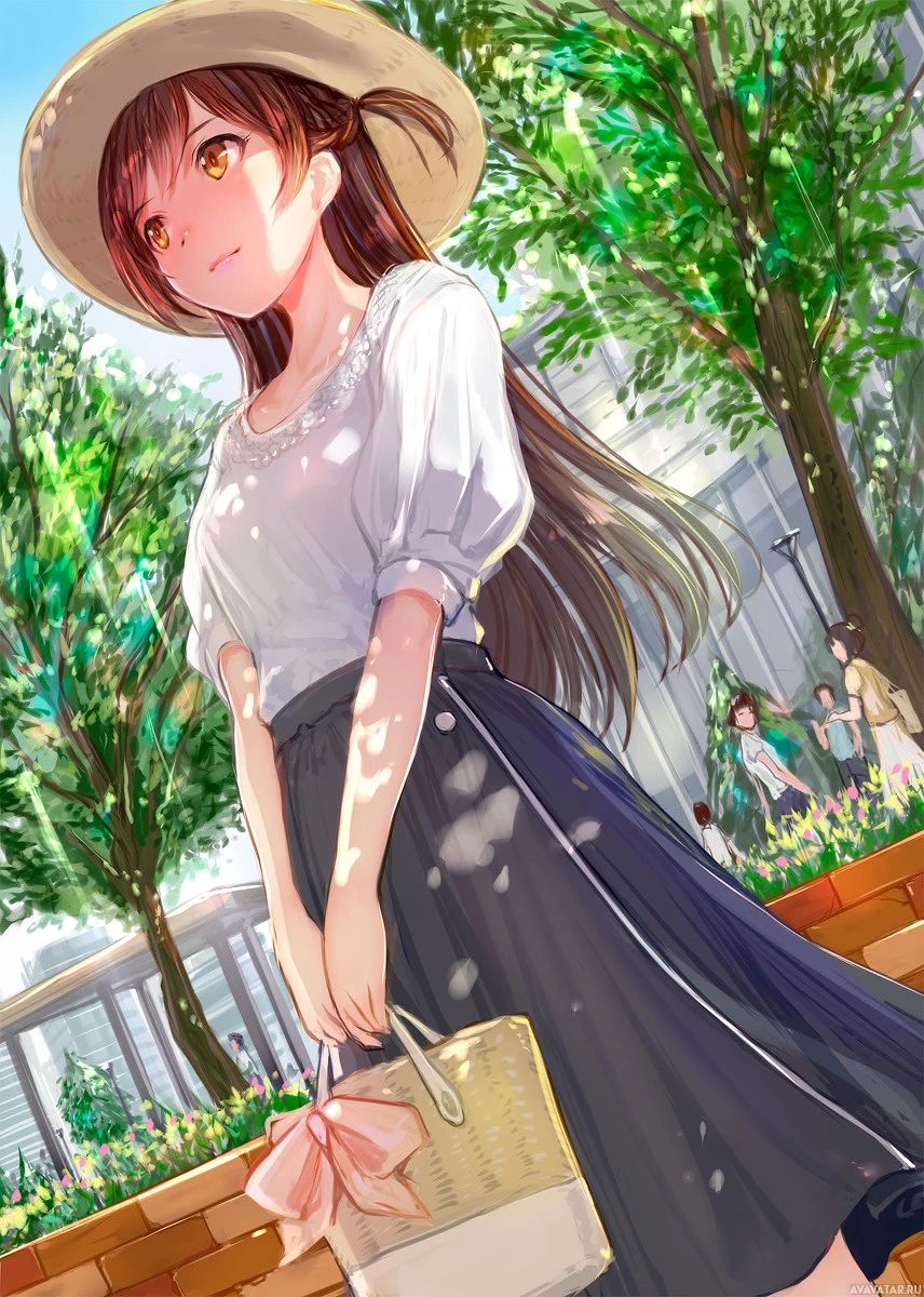 straw hat adorned with a pink bow sits on her head, adding to the casual yet stylish look of her outfit. The character appears to be standing in