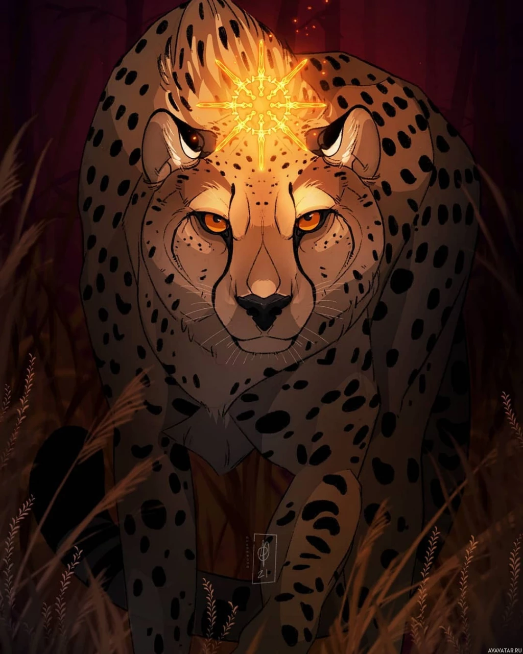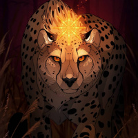 The image depicts a cheetah in a stylized, artistic rendering. The cheetah is shown in the foreground with its eyes glowing and a crown-like structure on its head, suggesting that it might be a character from a story or mythology rather than an actual animal in
