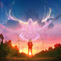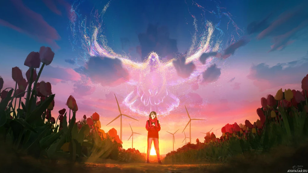 red flowers that could be tulips or another type of flower blooming amidst grass and plants. The overall scene has a serene yet powerful vibe, possibly indicating themes of change, resurrection, or the dawn of a new era.