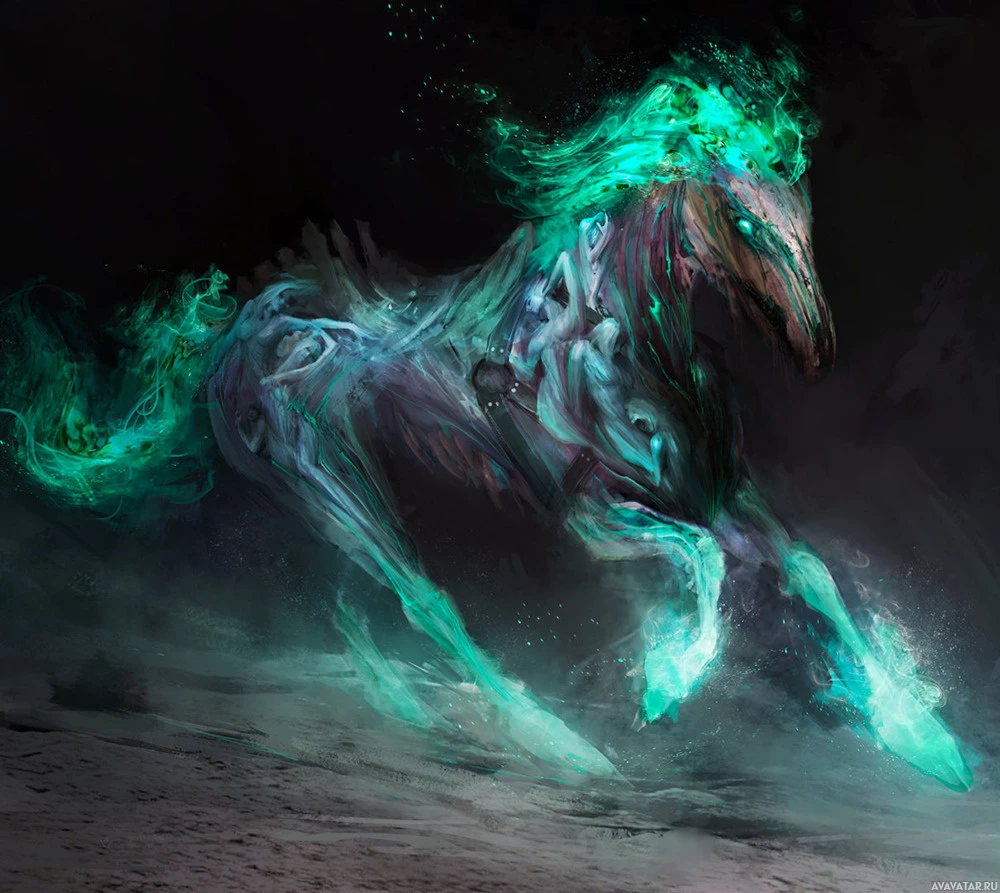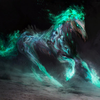 a fantastical creature that appears to be a fusion of a horse with some sort of magical or mythical elements. It has a green and blue color scheme, giving it an ethereal and otherworldly appearance. Its mane is glowing and seems to have some kind of energy or magic flowing through it, suggesting that this creature might possess