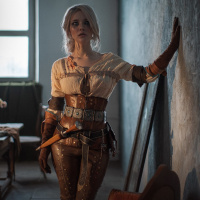 The image features a person dressed as Ciri from the game "The Witcher 3: