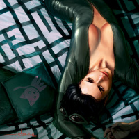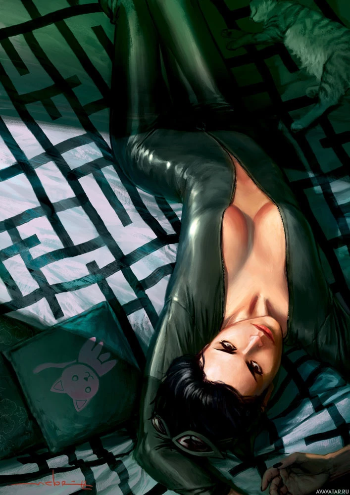The image depicts a character in a leather catsuit, which is reminiscent of Catwoman's