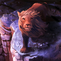 rocky terrain with what appears to be a meteorite or celestial debris nearby. The lion has