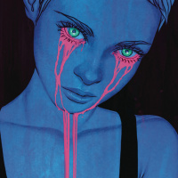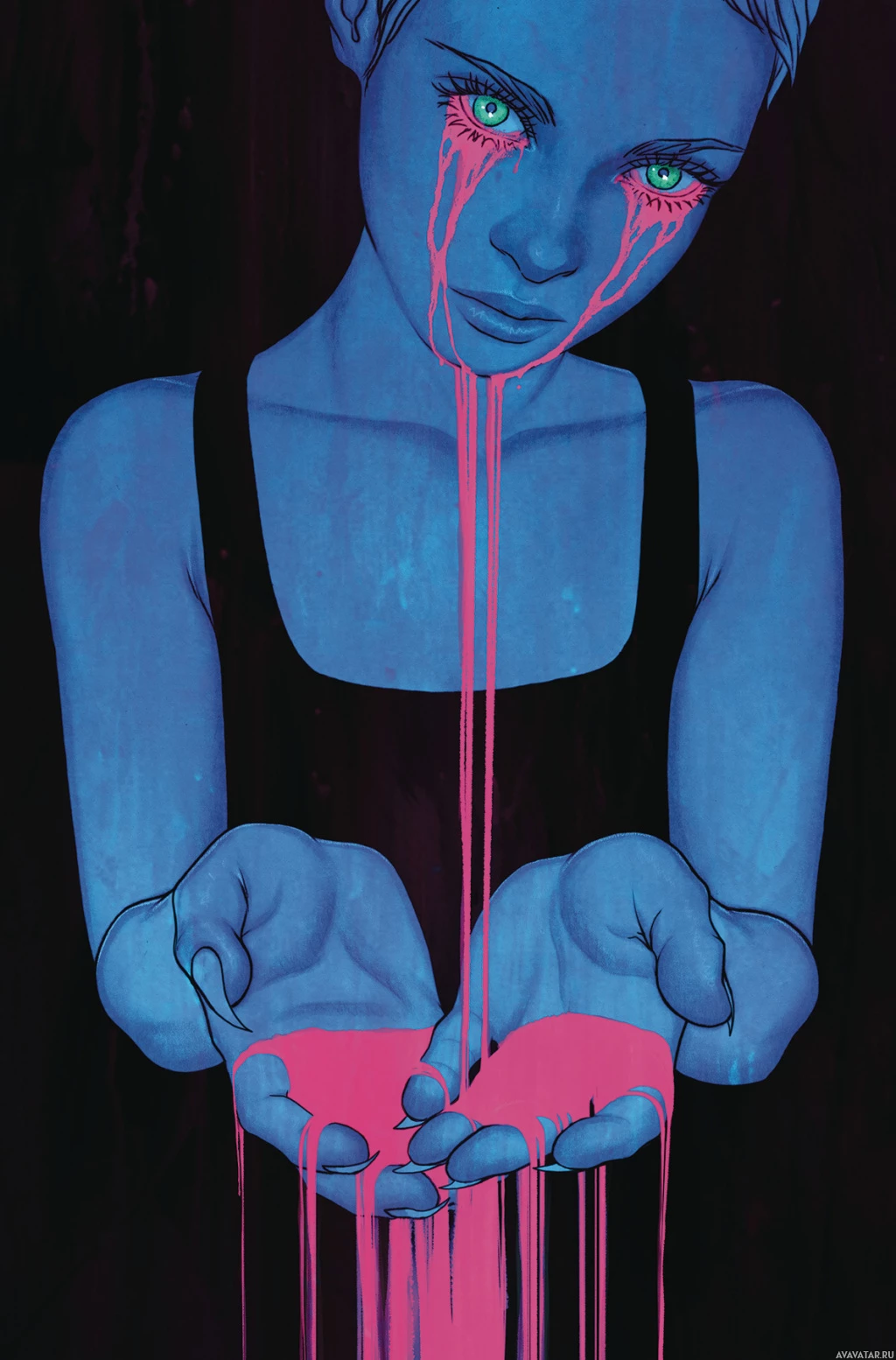 The image depicts an artistic illustration of a girl with tears in her eyes. She has a blue and black color palette, which is common for expressive digital artwork. The girl is reaching out towards the viewer with both hands, as if offering something or asking for help. There are splatters and drips around her that could symbolize emotions or the impact of tears on the environment. It's a poignant image that conveys