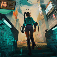 neon lights and advertisements, reflecting the art style often associated with futurism or cyberpunk genres. There's also