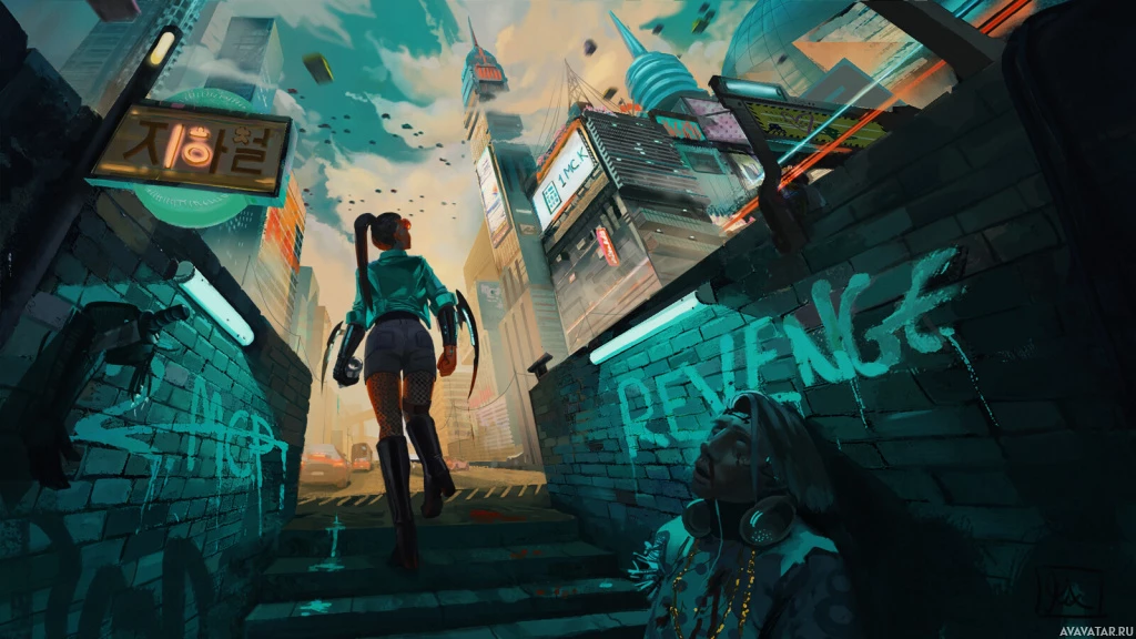 concept art, set in a futuristic urban environment. It features a character that looks like a girl from behind, depicted with an action-
