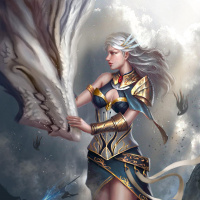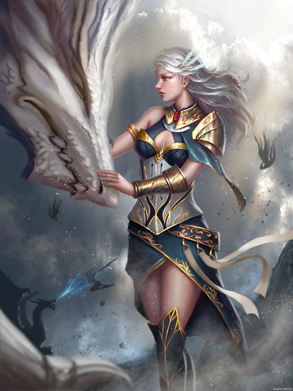 a female character with white hair and a dragon. The woman is dressed in what appears to be armor, suggesting a warrior or magical