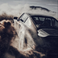 На картинке изображен движущийся автомобиль, поднимающий облако пыли или песка на грунтовой дороге. Скорее всего, это спортивный или высокопроизводительный автомобиль из-за его обтекаемого дизайна и того, как он справляется с пересеченной местностью.