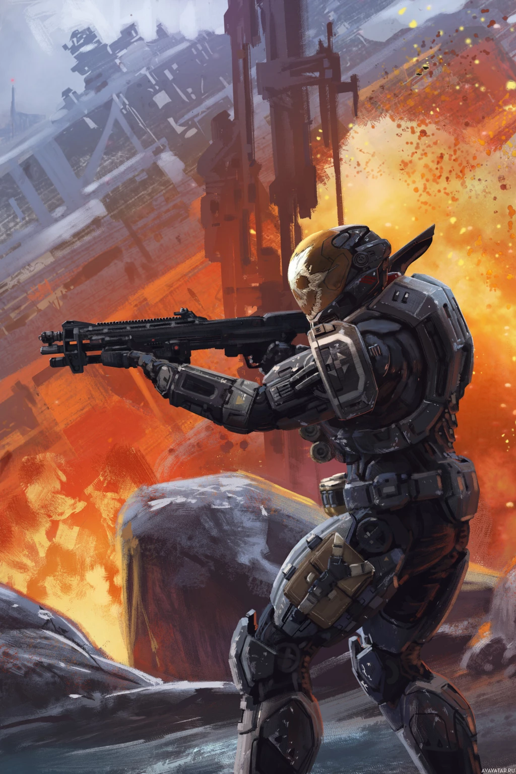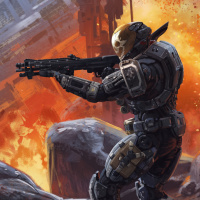 advanced armor and holding a weapon that appears to be designed for combat situations. There are